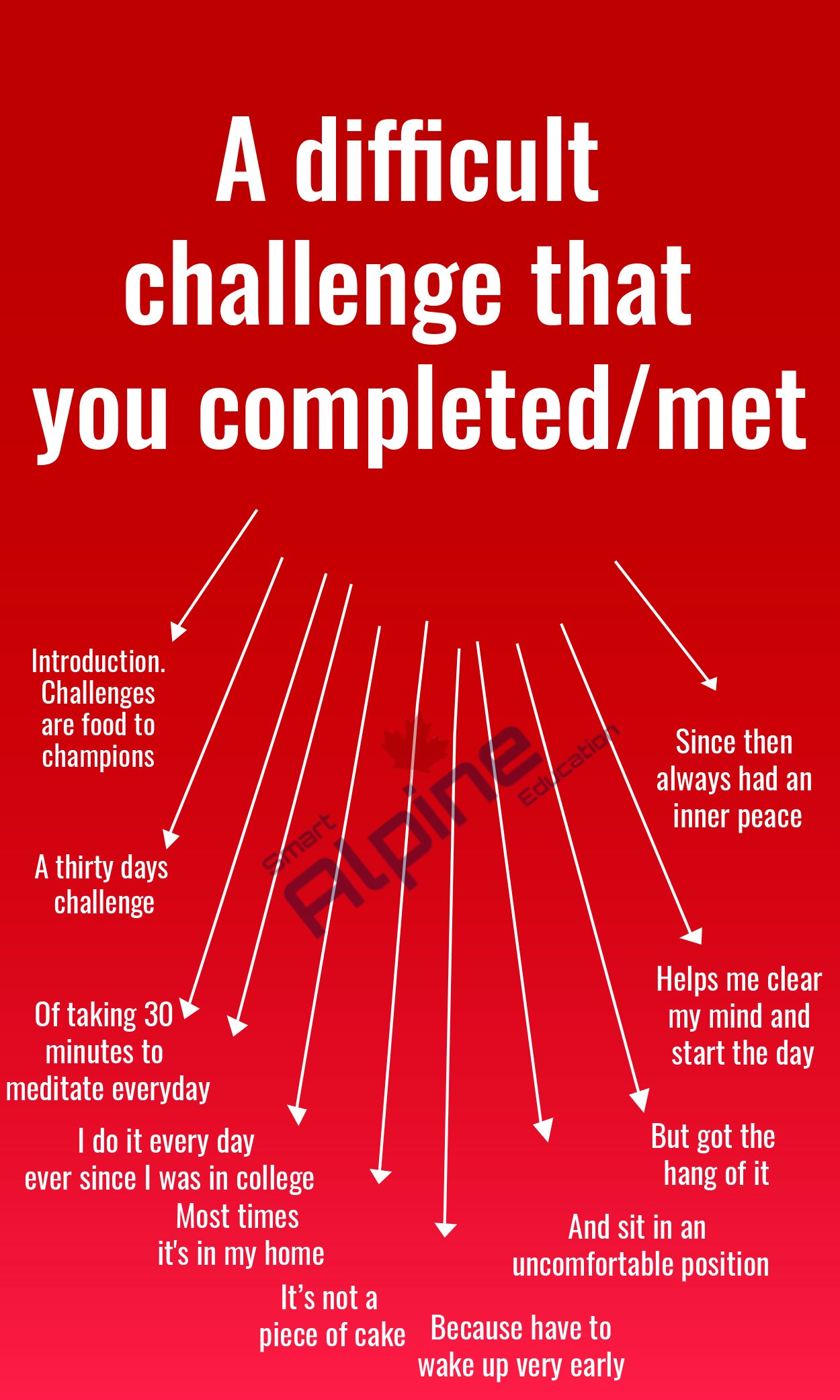 You should say -What was the challenge? -When and where did you complete/meet it? -Why was it difficult? -How did you feel about it? Model Answer